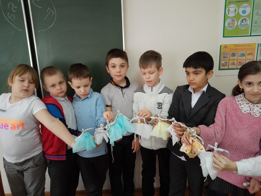 Юнармейцы «Дома Юнармии» города Новоалександровска: Долбня Александра, Лобач Семен, Лысоконь Дарья, Ванян Вероника, Герасименко Арина создали новогоднее настроение для детворы творческого объединения «Радуга» Детско-юношеского центра.